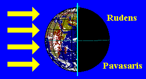 | Rudens, ap 23. septembri | Rudens punkts | 12h 00m | Austrumi | 33° | Rietumi |