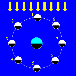 Aptuveni piecpadsmitajā dienā iestājas pilnmēness. Tad Mēness atrodas Saulei pretējā pusē. Tas labi redzams visu nakti |
