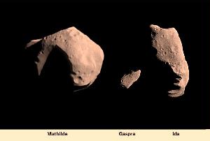 Mazās planētas Matilde, Gaspra un Ida (no kreisās) vienā mērogā. Krāsas nosacītas. NASA/JPL attēls. 29 kb
