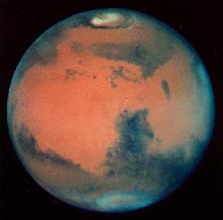 | Marss, kā tas izskatās spēcīgā teleskopā no Zemes. NASA/JPL attēls. 35 kb | Marsa pavadonis Foboss nosacītās krāsās. NASA/JPL attēls. 22 kb |