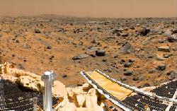 | Marsa panorāma, ko uzņēmusi zonde Viking. NASA/JPL attēls. 28 kb | Marsa akmeņainā virsma. Attēlu ieguvusi zonde Mars Pathfinder. NASA/JPL attēls. 28 kb |